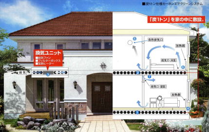 この炭を使用する工法「炭1トン仕様 カーボンエアクリーンシステム」は、住まいに1トンの炭を敷設し病院の手術室などにも使用される第2種換気と組み合わせたオリジナル換気システム。炭の層を通った空気を室内に24時間循環させ、爽やかで健康的な空気環境をつくります。